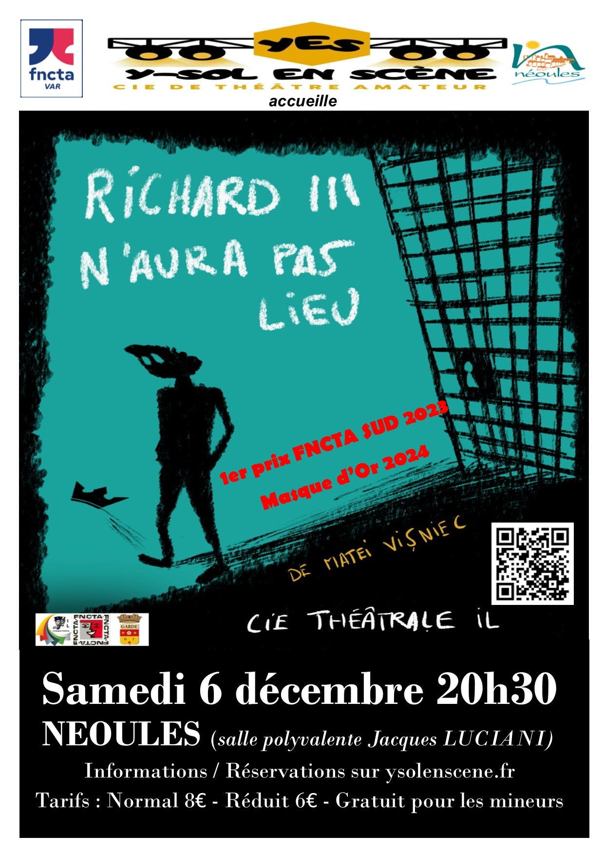 La compagnie de théâtre Y-sol en scène accueille la "Cie théâtrale il" qui présentera "Richard III n'aura pas lieu", de Matéi Visniec, 1er prix FNCTA SUD 2023. Réservation sur www.ysolenscene.fr/billeterie Tarifs | Normal 8 € - Réduit 6 € - Gratuit pour les mineur