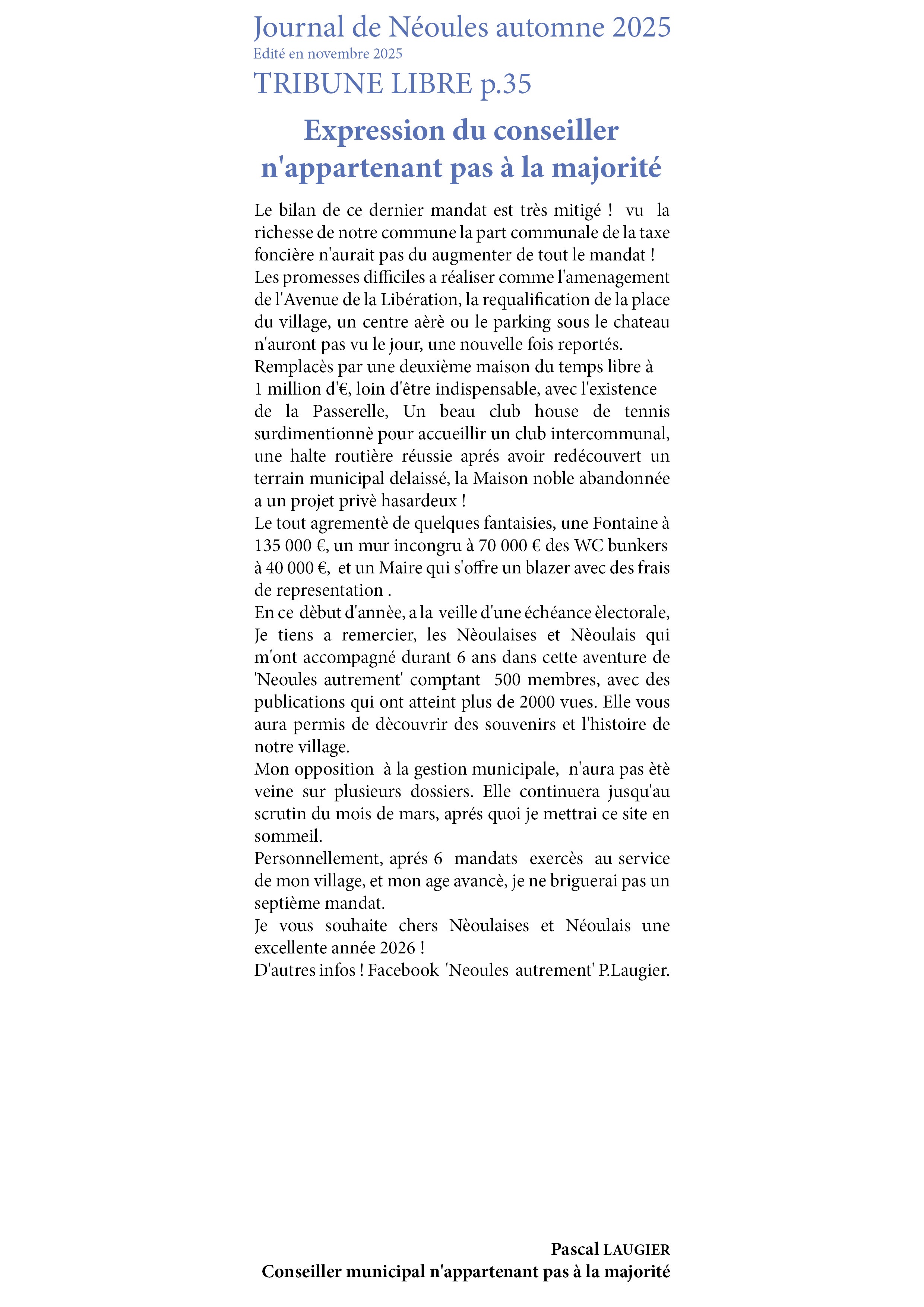 - 2025-05-27 Expression du conseiller municipal n'appartenant pas à la majorité - Journal de Néoules printemps été 2025