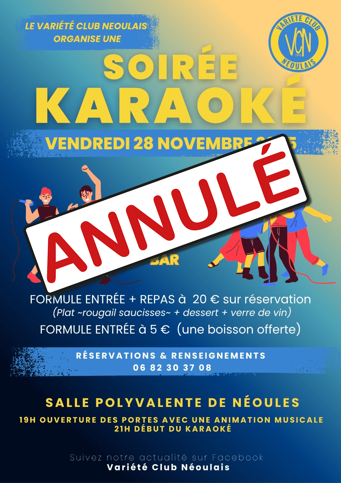 Salle polyvalente Jacques LUCIANI NéoulesL'association Variété club Néoulais vous propose un karaoké avec repas ! 19 h | Ambiance musicale 21 h | karaoké live Formule repas | Menu 20 € | […]
