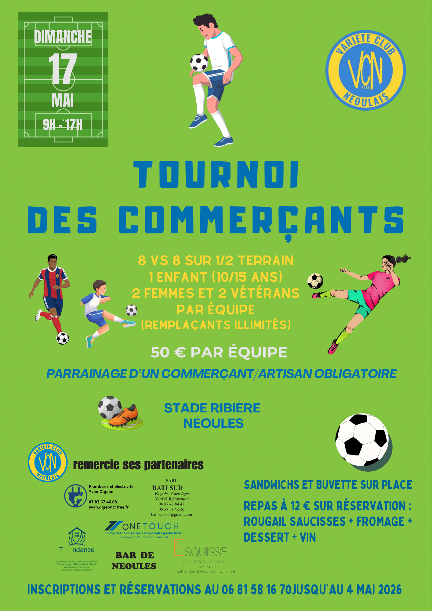 Stade Ribière Espace sportif Ribière, Néoules, FranceL'association Variété club néoulais organise le tournoi de football des commerçants ! 8 contre 8 sur demi-terrain (1 enfant de 10 à 15 ans, 2 femmes et 2 vétérans […]