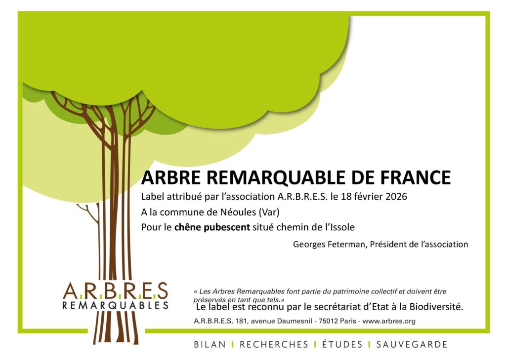 Le grand chêne pubescent situé chemin de l’Issole a obtenu le label national « Arbre remarquable de France », attribué par l’association A.R.B.R.E.S.