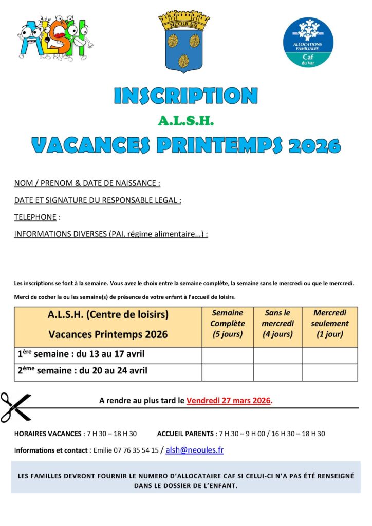 Document téléchargeable sur le site de la commune https://neoules.fr/accueil/vie-quotidienne/jeunesse/alsh/
