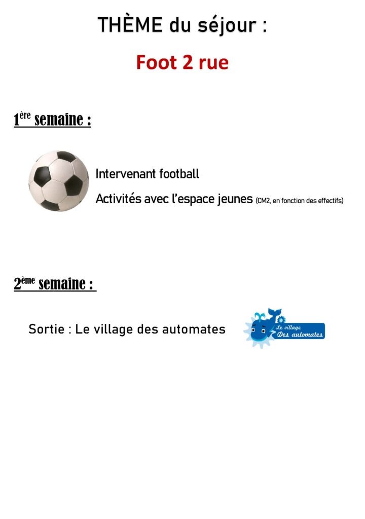 - 1ère semaine | Intervenant football et activités avec l’espace jeunes (CM2 en fonction des effectifs)