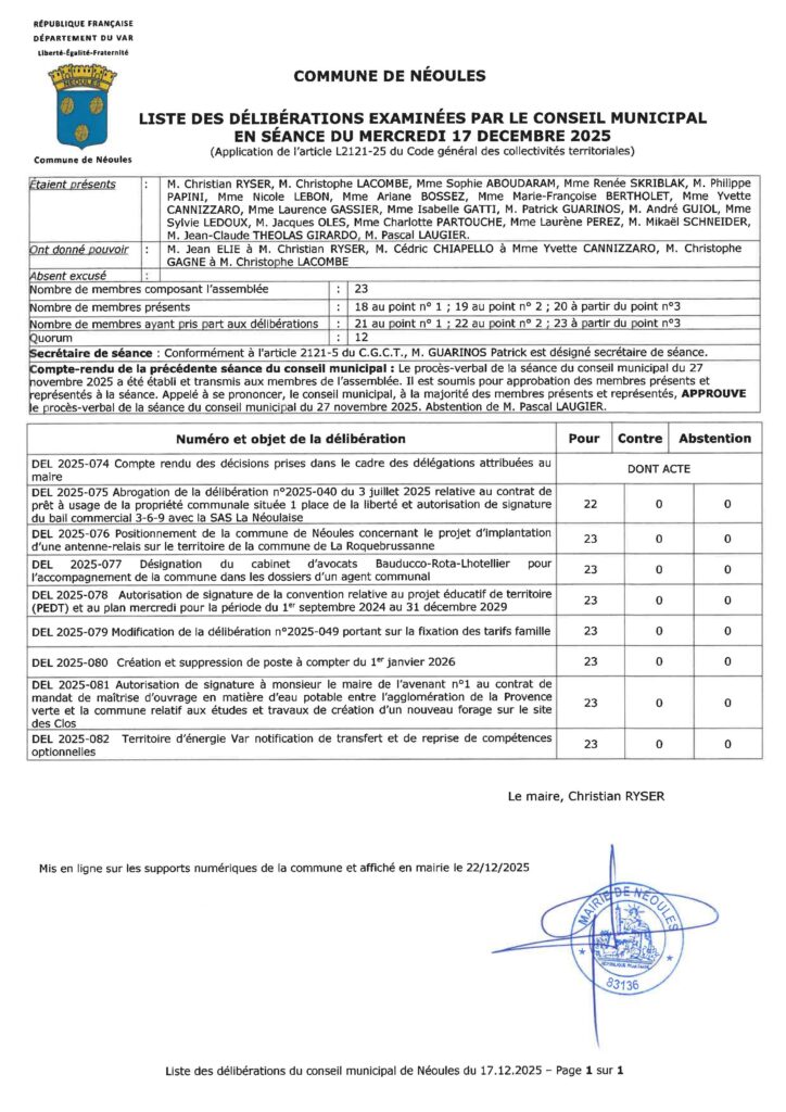 Vous pouvez consulter et télécharger la liste des délibérations examinées par le conseil municipal en séance du 27 novembre 2025