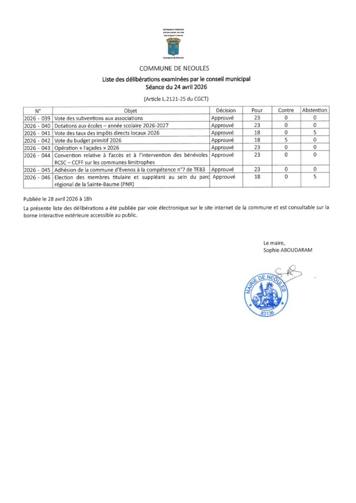 Vous pouvez consulter et télécharger la liste des délibérations examinées par le conseil municipal en séance du 24 avril 2026