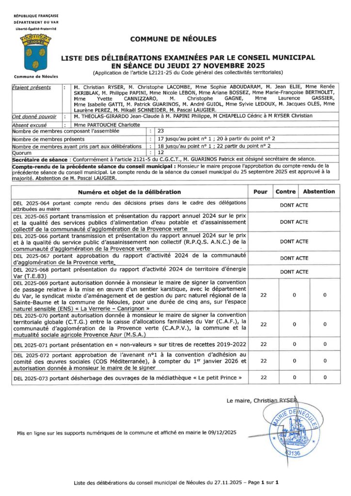 Vous pouvez consulter et télécharger la liste des délibérations examinées par le conseil municipal en séance du 27 novembre 2025