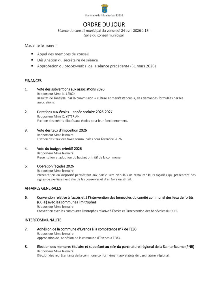 Vous êtes ici : Accueil > Actualités > Conseil Municipal > Ordre du jour du conseil municipal du 24 avril 2026