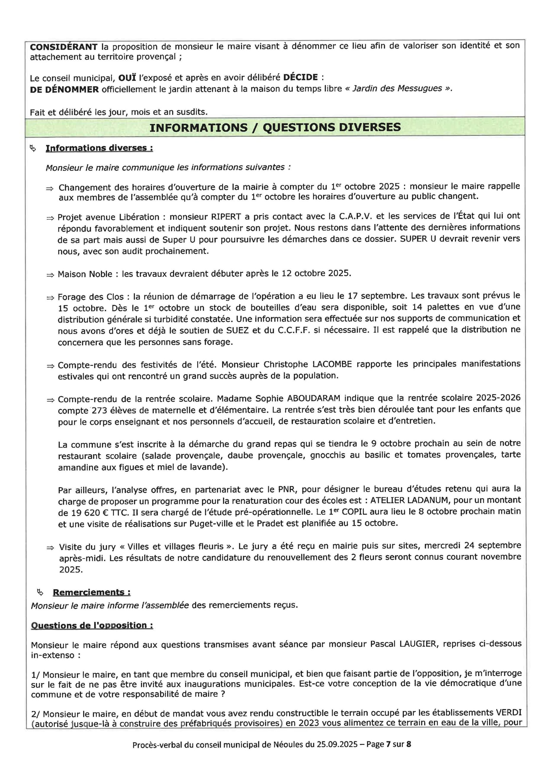 Procès-verbal de la séance du conseil municipal du 25 septembre 2025 retrace l’ordre du jour ainsi que les échanges. Il a été approuvé en séance du conseil municipal du 27 novembre 2025.