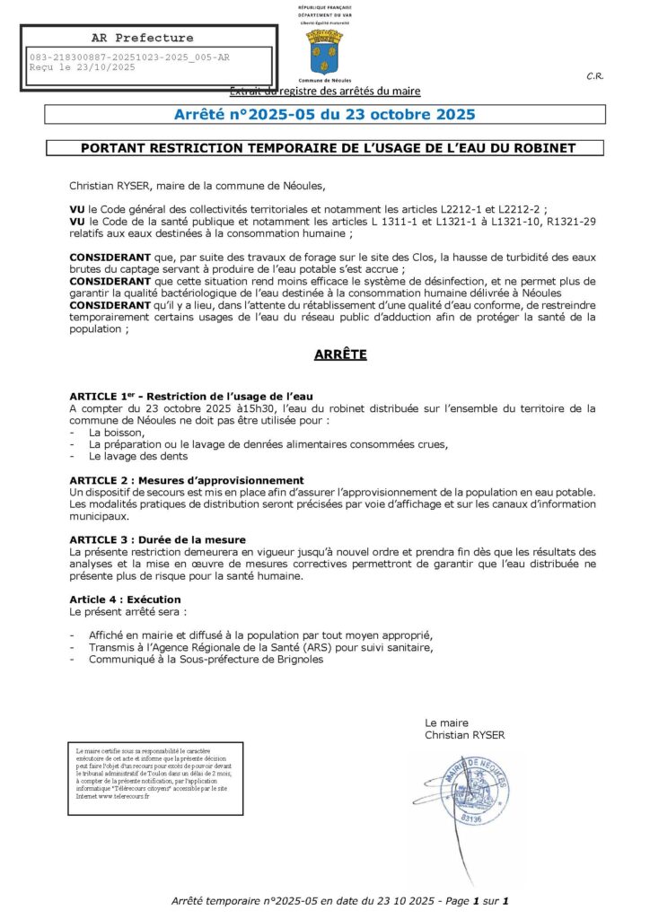 A compter du 23 octobre 2025, 15 h 30 , l’eau du robinet distribuée sur l’ensemble du territoire de la commune de Néoules ne doit pas être utilisée pour :